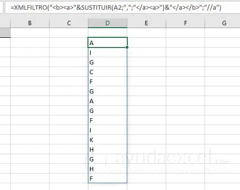XMLFILTRO(«<b><a>»&SUSTITUIR(A2;»,»;»</a><a>»)&»</a></b>»;»//a»)