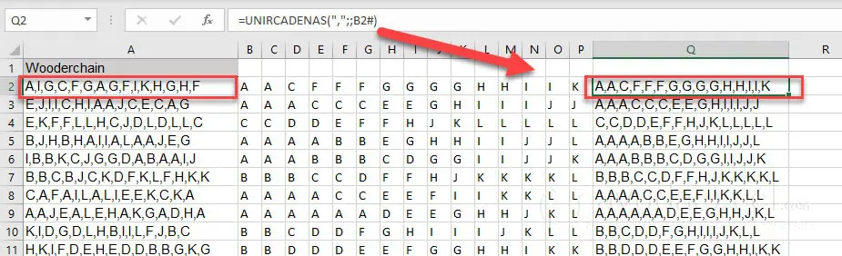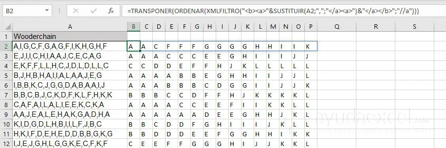 =TRANSPONER(ORDENAR(XMLFILTRO(«<b><a>»&SUSTITUIR(A2;»,»;»</a><a>»)&»</a></b>»;»//a»)))