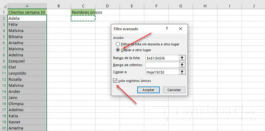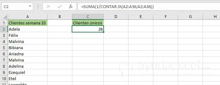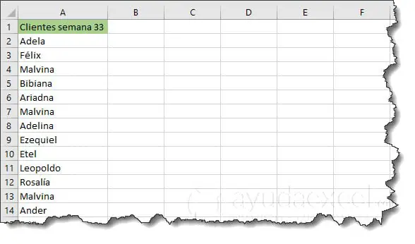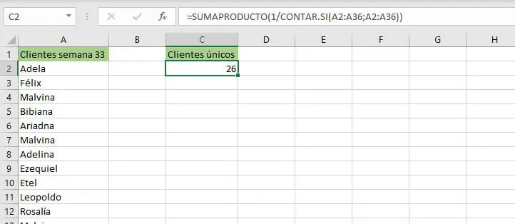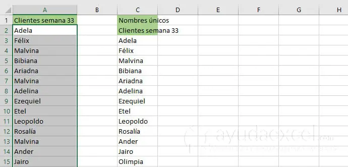 Imagina que tienes un rango con los nombres de los clientes de la última semana. Cada vez que realizan una compra se registran sus datos en el ERP y, por tanto si uno de ellos compra varias veces, su nombre aparece repetido.