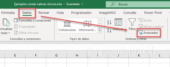 El Filtro avanzado se encuentra en el botón Avanzadas del grupo Ordenar y filtrar de la ficha Datos. Haz clic en él.