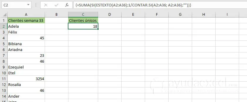 =SUMA(SI(ESTEXTO(A2:A36);1/CONTAR.SI(A2:A36; A2:A36);»»))