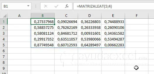 Resulta curioso que se puedan introducir cinco argumentos y que los cinco sean opcionales ¿verdad? Si no introduces ninguno de ellos la función devuelve una matriz de una fila por una columna entre los números 0 y 1 (exactamente igual que ALEATORIO).