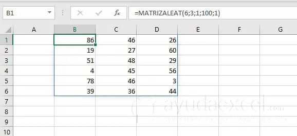 Para generar una matriz de 6 filas y tres columnas de números enteros comprendidos entre 1 y 100 introduce la siguiente fórmula: