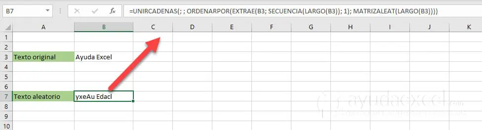 En la celda B3 tengo una cadena de caracteres. Como ves en la imagen es posible ordenarlos de forma aleatoria: