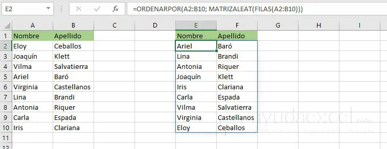 Los ejemplos anteriores estaban basados en números pero también es posible obtener una matriz de letras aleatorias a partir de un ejemplo. Echa un vistazo a esta fórmula:
