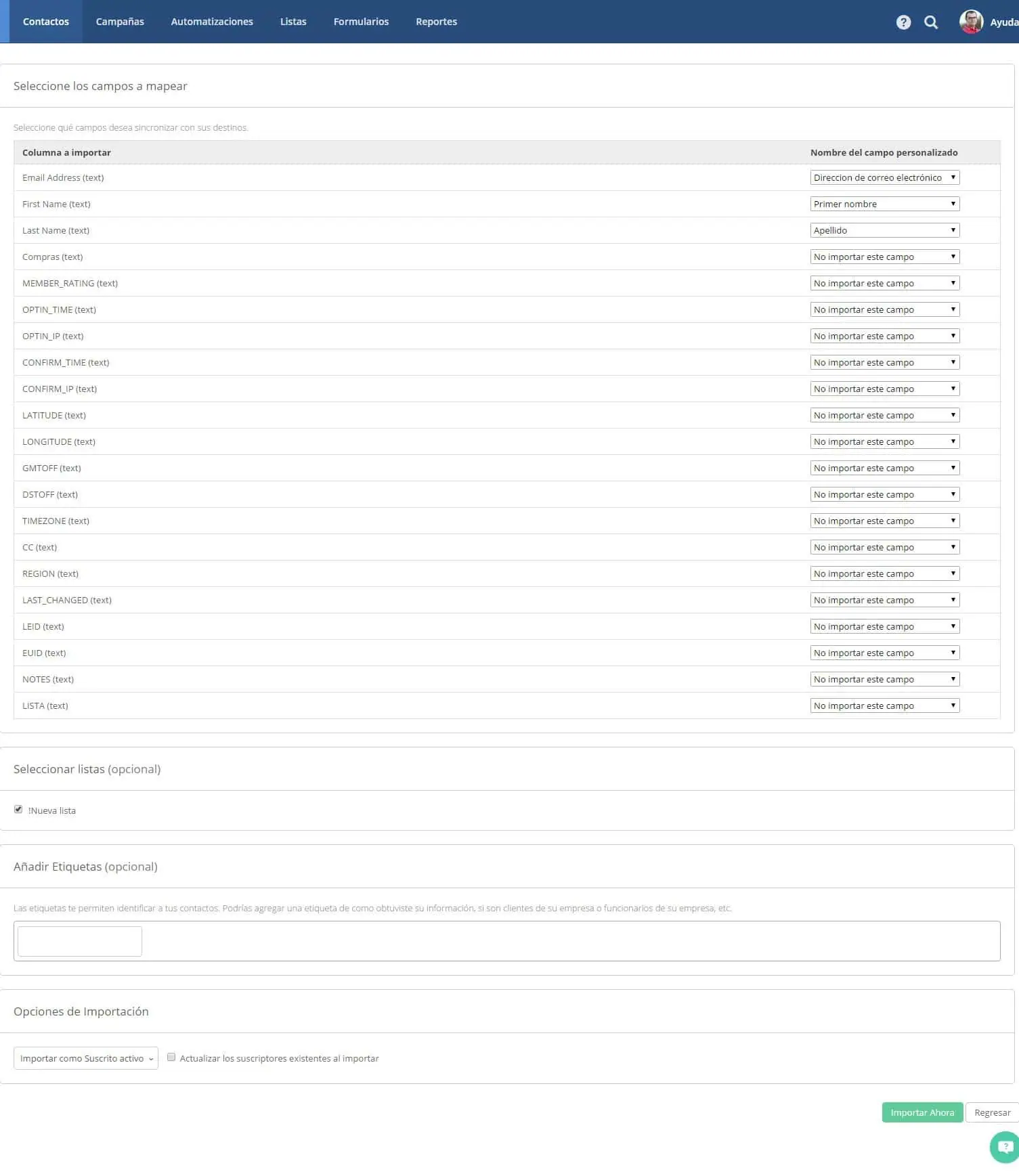 - Para mapear correctamente los campos debes seleccionar de cada desplegable de la derecha, los campos que correspondan al archivo que has subido. Los campos más importantes, y que debes asegurarte de que están bien seleccionados son el correo electrónico, el nombre, el apellido y el nuevo campo agregado (Lista). Al campo Lista debes asignarle el valor Etiqueta del cuadro desplegable.