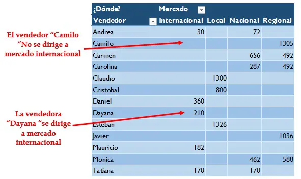 El fin de esta primera tabla dinámica es observar a qué mercados se dirige el vendedor, mirando en el área de valores los lugares que tengan algún número (No importa qué valor contenga). La siguiente imagen detalla lo descrito anteriormente: