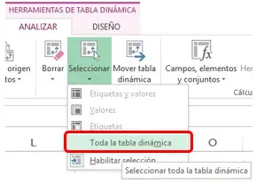Cree la segunda tabla dinámica con el mismo origen de datos que la anterior (Tabla Dinámica1). Esta vez en lugar de crearla desde cero, vamos a duplicar la primera. Para esto, dejamos la celda activa en cualquier lugar dentro de la tabla dinámica, luego vamos a la pestaña Analizar, opción Seleccionar, Toda la tabla dinámica.