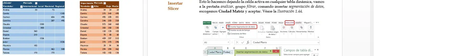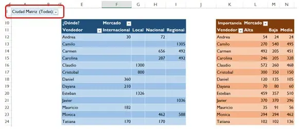 Para brindar una forma alterna y de una lectura más clara, vamos a crear dos tablas dinámicas, la primera de ellas va a mostrar los vendedores y a que mercados se dirige, la segunda mostrará los vendedores y la valoración de producto, luego las sincronizaremos a una “lista desplegable” para que la información presentada en los dos reportes se filtren de acuerdo a la ciudad seleccionada.