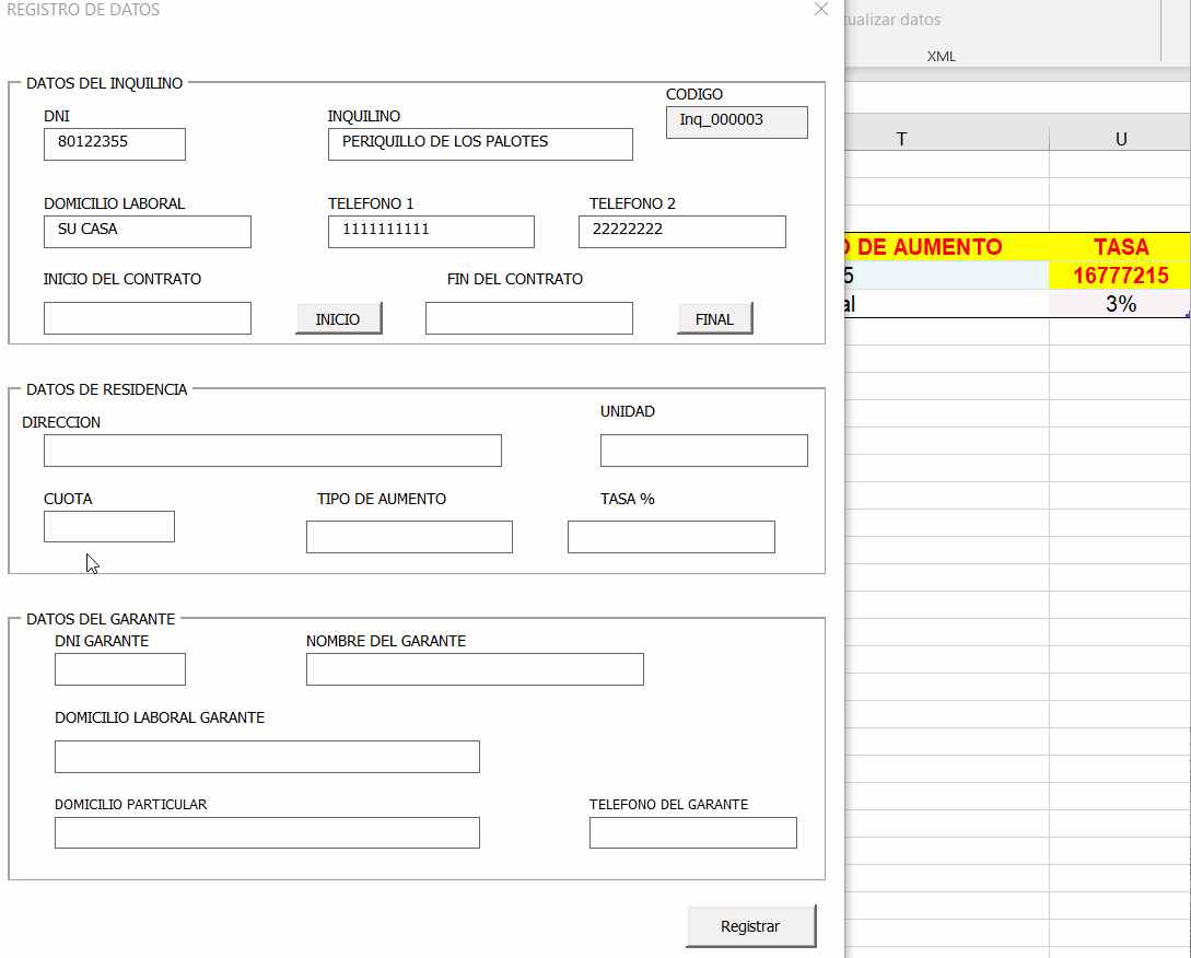 Saludos apreciados Foreros, Tengo un error en mi código vba que al agregar un dato (Botón agregar), los datos del formulario tipo de aumento, tasa% y Domicilio laboral me carga otra cosa que no es lo que preciso. 1.- Tipo de Aumento: debe ser semestral, bimensual o cuatrimestral me carga un dato numérico (16777215) 2.- Tasa - Domicilio laboral: Repite en mismo dato numérico (16777215) Les dejo el archivo para ver si me puede dan una mano con ello. De antemano Gracias Inmobiliaria AYUDA EXCEL.xlsm