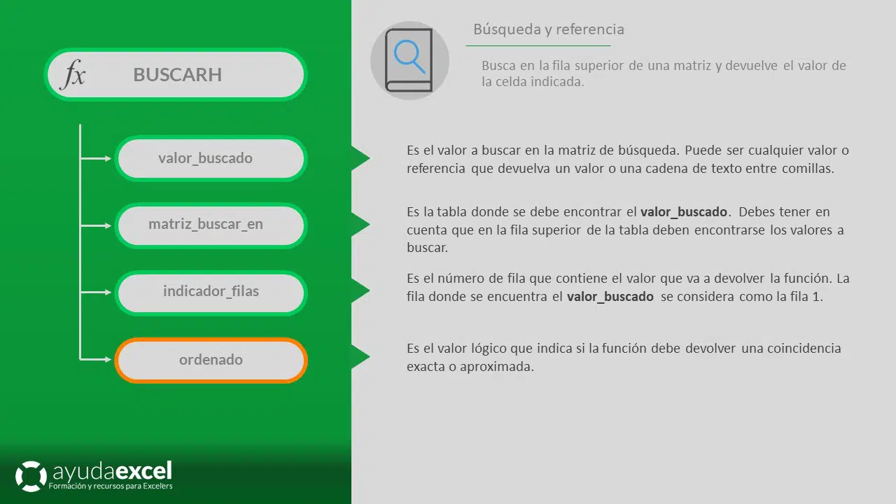 =BUSCARH(valor_buscado;matriz_buscar_en;indicador_filas;ordenado)