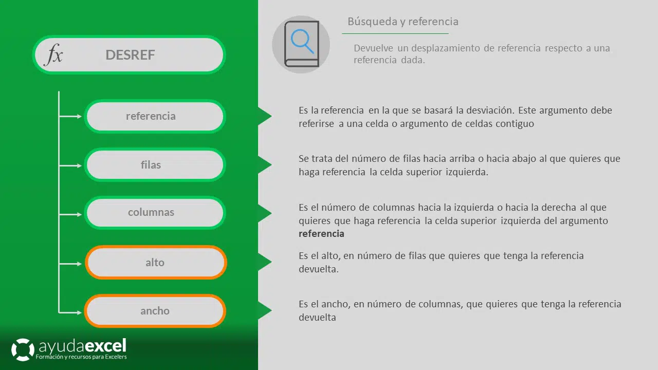 La función DESREF es una de mis favoritas. Es de las funciones que se suelen utilizar como argumento de otras funciones, ya que muchas veces no tiene sentido utilizarla sola.