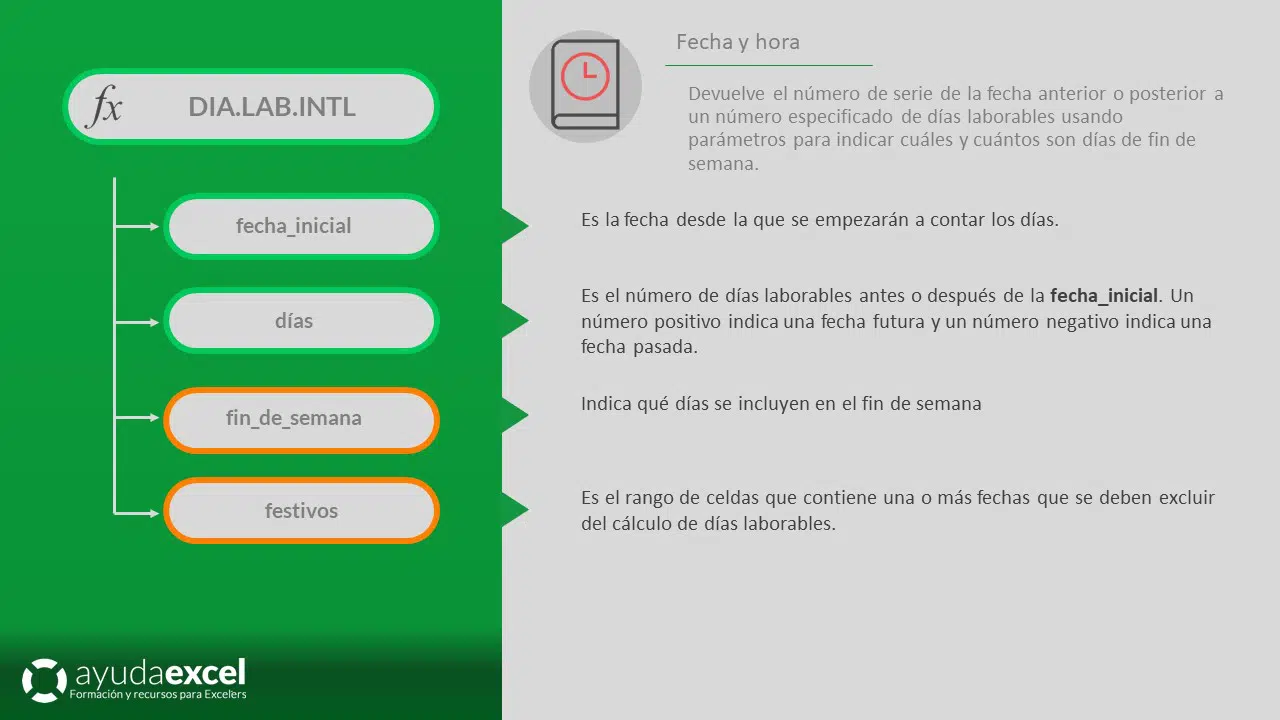 - DIA.LAB.INTL no permite definir días no laborables adicionales más allá de los festivos especificados en el argumento festivos. Para configuraciones más complejas, considera combinarla con otras funciones lógicas.