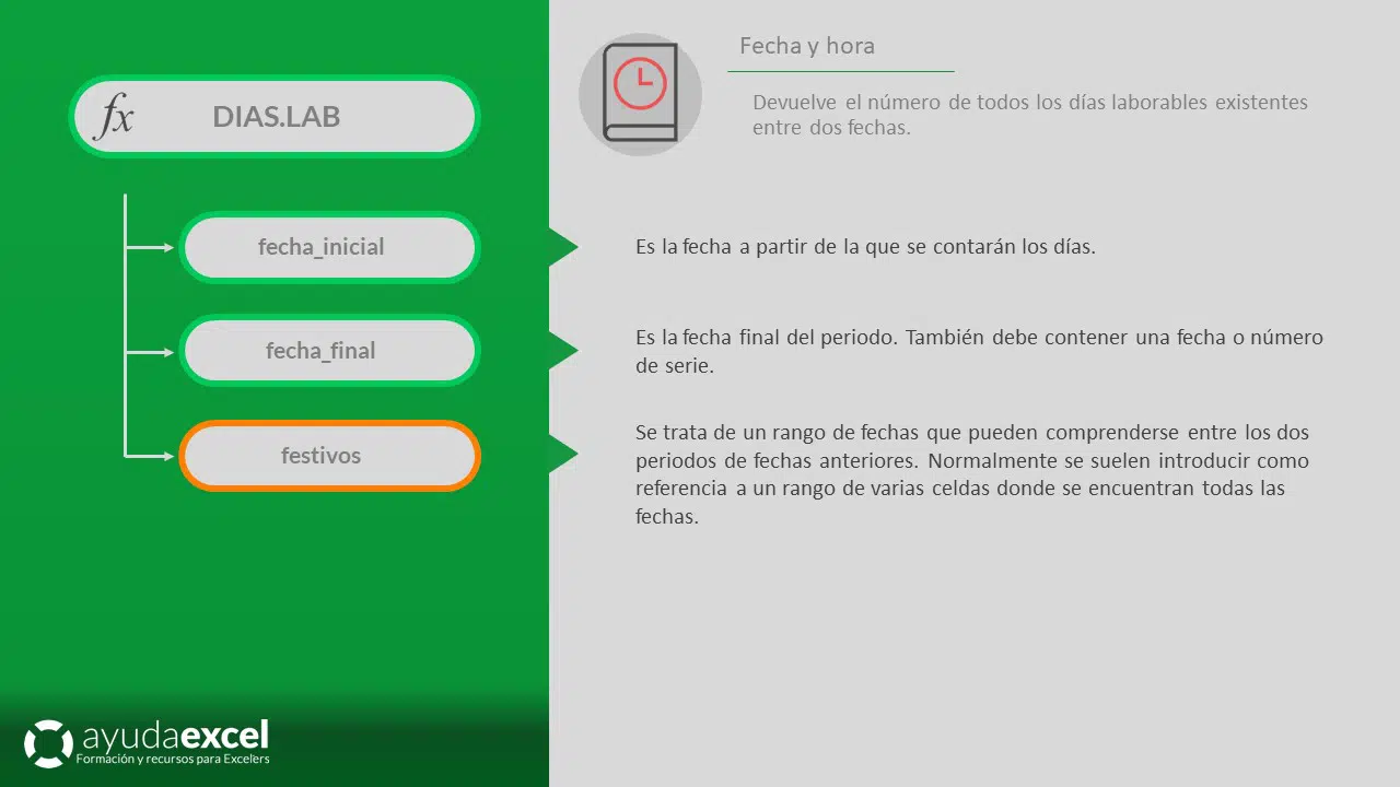 =DIAS.LAB(fecha_inicial; fecha_final; [festivos])