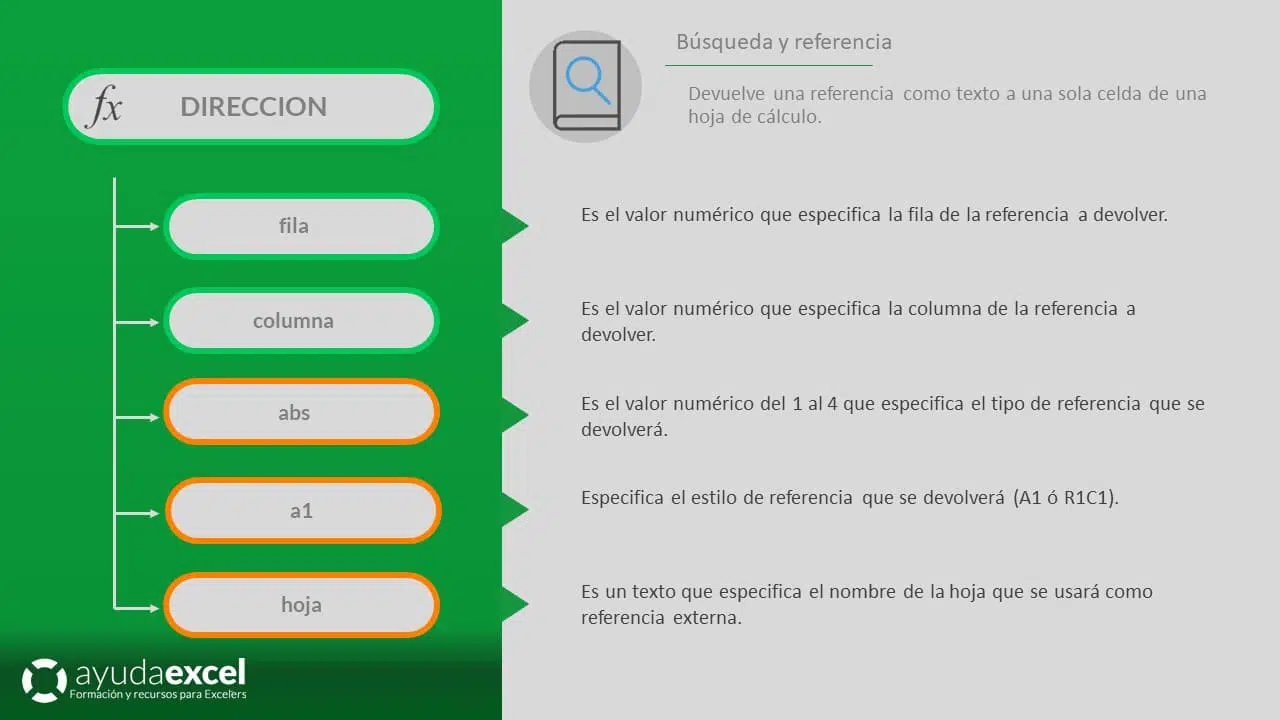 La función DIRECCION devuelve una referencia de celda como texto, dada una fila y columna específicas. Es útil para crear referencias de celda dinámicas que pueden ser utilizadas en otras fórmulas. DIRECCION permite especificar si la referencia es absoluta o relativa, el estilo de referencia (A1 o F1C1) y, opcionalmente, el nombre de la hoja.