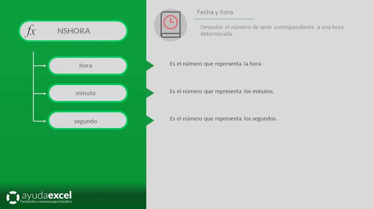 - Ejemplo: =NSHORA(14; 30; 0) para crear la hora 14:30:00.