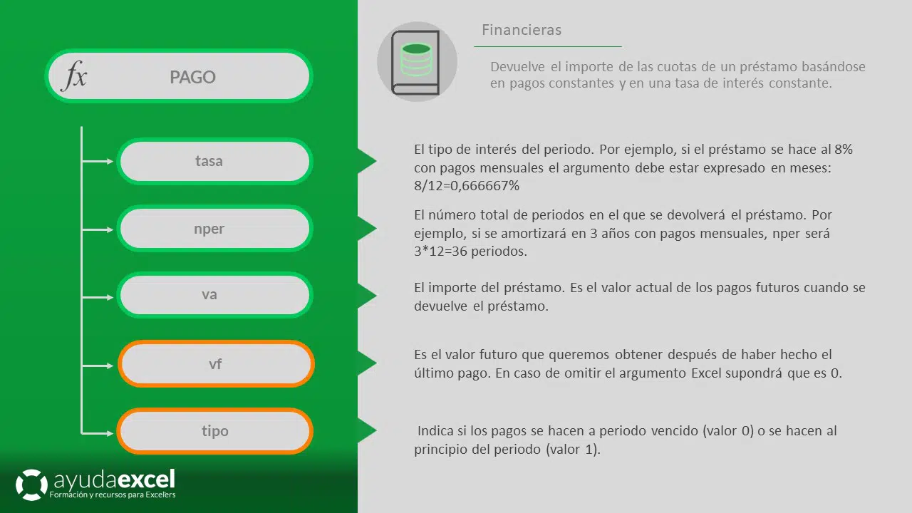 10000para un préstamo de 10.000 €). - vf: Opcional. Es el valor futuro o el saldo que se desea alcanzar después del último pago. Debe ser un número positivo. Si se omite, Excel asume que vf es igual a 0, lo que significa que el préstamo se amortiza completamente.
