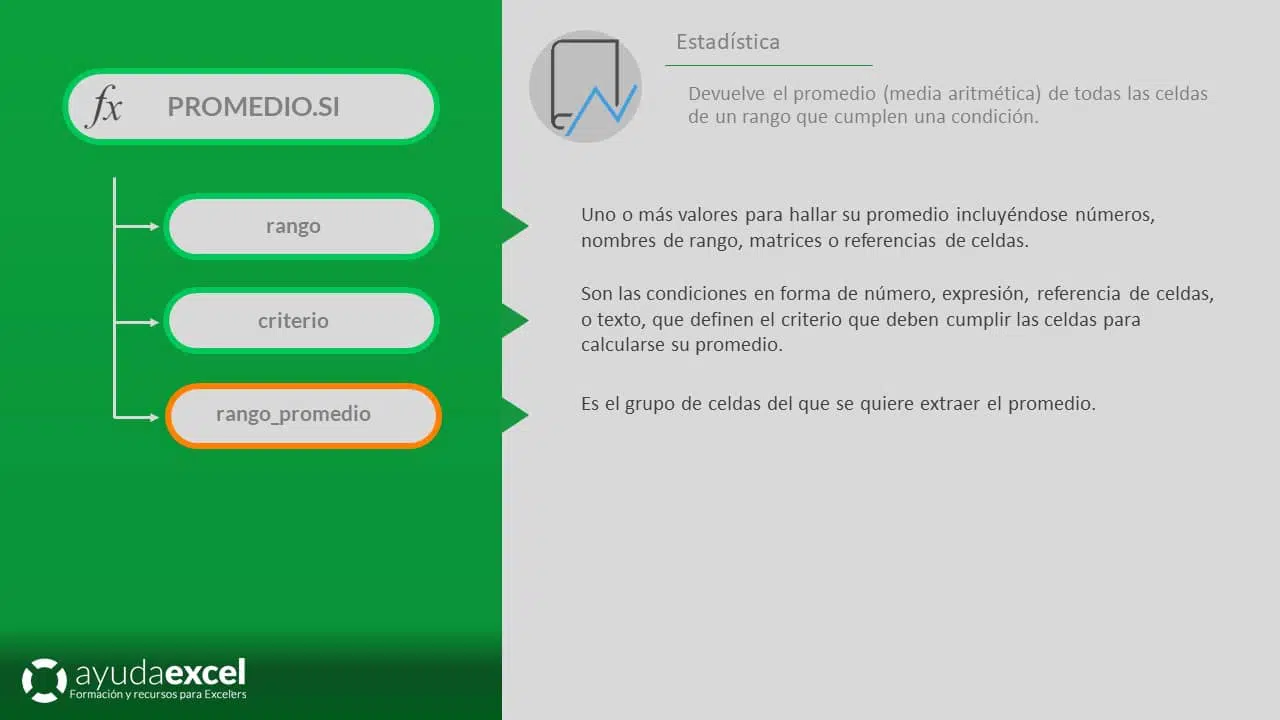 - rango_promedio: Opcional. Es el rango de celdas de donde se tomará el valor para calcular el promedio. Si se omite, se utilizará el mismo rango para calcular el promedio.