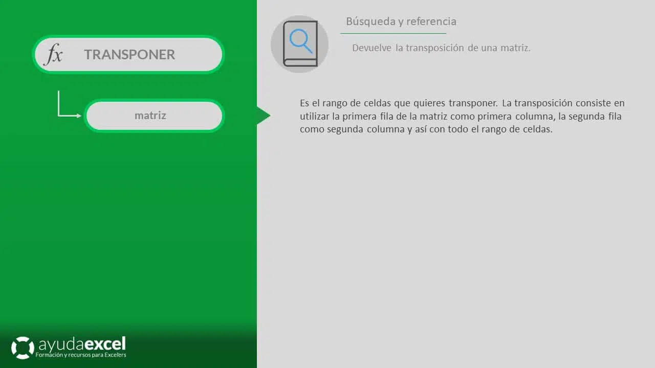 La función TRANSPONER devuelve una matriz transpuesta de una matriz especificada, es decir, convierte filas en columnas y columnas en filas. Es especialmente útil cuando necesitas reorientar los datos de una tabla o matriz sin tener que reescribirlos manualmente.