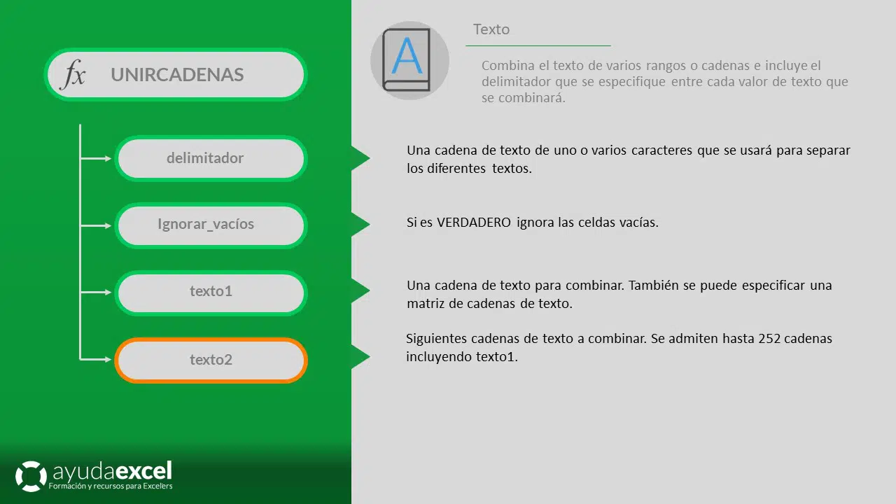 - Ejemplo: =UNIRCADENAS(«, «; VERDADERO; A2