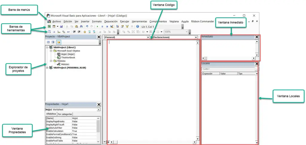 - Barra de menú: Aquí se encuentran todas las opciones del editor de VBA. Es similar a la cinta de opciones de Excel. Contiene comandos que puedes usar cuando trabajes con el editor de VBA.