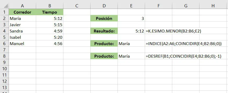 Para conocer el tiempo que tardó el tercer corredor en una carrera, se utiliza K.ESIMO.MEJOR, ya que se parte del valor más bajo del rango: