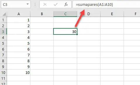 Usa esta función e introduce un rango de celdas con números. El resultado de la función devolverá un valor: la suma de todos los números pares: