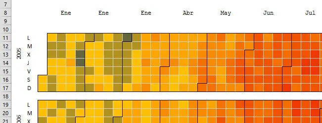 La siguiente plantilla de Excel, consigue, mediante formatos condicionales y fórmulas, crear un mapa de calor diario, es decir, se muestran los valores representándolos por un color condicional. Es una modificación de una plantilla que elaboré para un cliente que tenía unas necesidades totalmente diferentes, pero la he adaptado a otros usos.