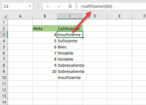 También puedes crear una función personalizada (una UDF o User Defined Function) para devolver la calificación del examen según la nota introducida en una celda. La función personalizada se podrá usar como cualquier función de hoja de Excel.