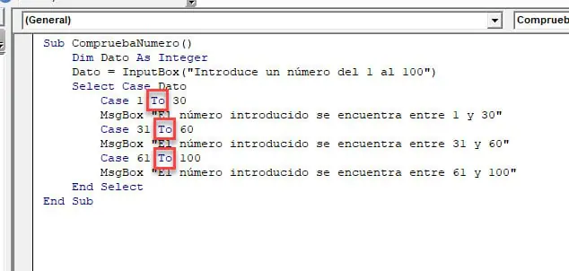 La cláusula To simplifica esa tarea pudiendo comprobar en una sola línea si el número introducido se encuentra en un rango de números. Observa el siguiente procedimiento: